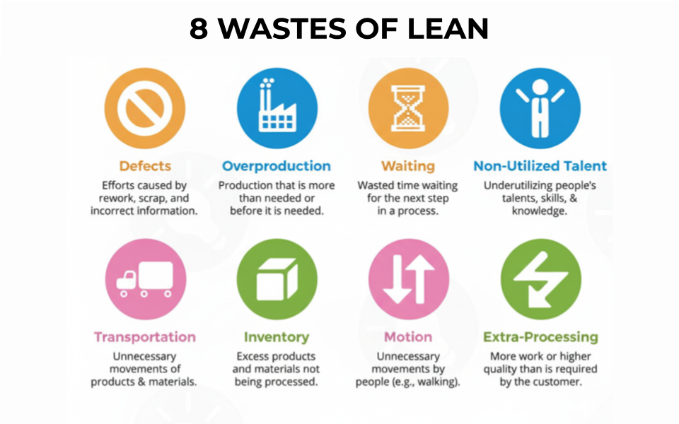 Trọng tâm của Lean là nhận diện và loại bỏ lãng phí (Muda) – bất kỳ hoạt động nào tiêu tốn tài nguyên nhưng không tạo thêm giá trị cho sản phẩm hoặc dịch vụ theo quan điểm của khách hàng. Ban đầu, Taiichi Ohno, kỹ sư trưởng của Toyota, đã xác định 7 loại lãng phí. Về sau, thế giới phương Tây bổ sung thêm loại lãng phí thứ 8, hình thành nên mô hình 8 loại lãng phí thường được biết đến với tên viết tắt DOWNTIME. Việc hiểu và loại bỏ 8 “kẻ thù giấu mặt” này là chìa khóa để tối ưu hóa mọi quy trình.